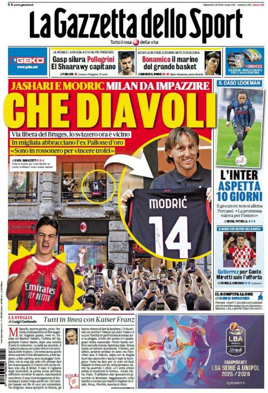 La Gazzetta apre con la presentazione di Modric, la deadline fissata dall’Inter per Lookman ed il mercato del Napoli.