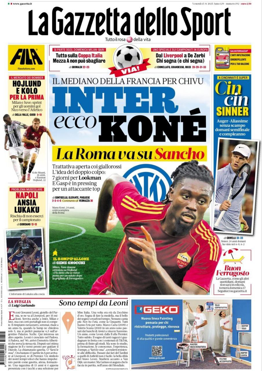 La Gazzetta apre con la sorpresa Koné-Inter e l’affare Roma-Sancho. Spazio alla vittoria di Sinner ed al mercato di Milan e Juventus.